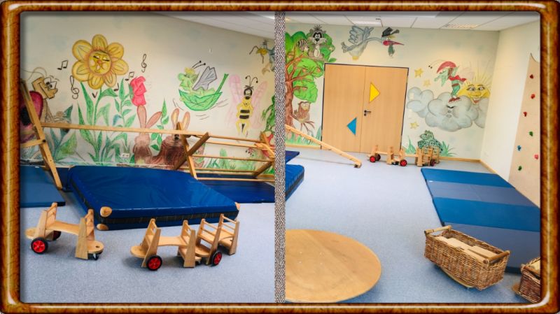 Unser Bewegungsraum ist für die Kinder täglich zugänglich. Hier können sich die Kinder an der großen Bewegungsbaustelle von "Elfriede Hengstenberg" erproben. Mit diesen Materialien können wir für das Kind unterschiedliche Klettergelegenheiten und Bewegungsspiele schaffen, um der Eigenaktivität und der Bewegungsfreude des Kindes einen Raum zu geben.